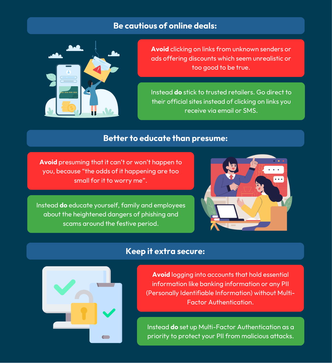 Do instead: Educate yourself, your family, and your employees on the heightened risks of scams during this period. Understanding what to look for and how to respond is key to staying safe. Simple actions, like identifying suspicious emails or verifying the authenticity of websites, can go a long way.